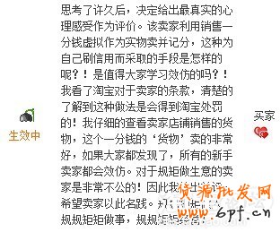 我是剛開的店鋪。說實話,我也想自己店鋪的信譽能夠提升,也試了這種方法。確實,放上去,店鋪的信譽也有所提高,實用。當初開店沒有對《淘寶規則》詳細的閱讀,也就對這種違規行為沒在意,自己碰到了一個買家在買我的“一分錢購物體驗”的寶貝以后。買家先是在旺旺跟你說: