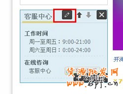 這樣,頁面的對(duì)應(yīng)位置就出現(xiàn)了一個(gè)客服中心的模塊,鼠標(biāo)放在上面,會(huì)顯示如下的結(jié)果,點(diǎn)擊編輯按鈕,就可以增加客服了。(如果是使用系統(tǒng)模板的,只能增加一個(gè)主賬號(hào),要想添加多個(gè)旺旺客服,需要使用新模板)