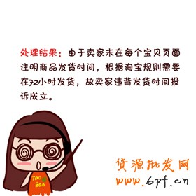 (如果店鋪放假,在節(jié)假日內(nèi)必須每個(gè)寶貝都注明發(fā)貨時(shí)間,非節(jié)假日,建議下架),若只在店鋪公告,主圖,簽名等注明,違背發(fā)貨時(shí)間承諾成立。賣家未按照淘寶規(guī)定的72小時(shí)發(fā)貨或者是未按照與買家約定的發(fā)貨時(shí)間發(fā)貨而被投訴的,商家可以在小二未處理前做好賠付(交易金額的5%,不超過30元)或者和買家協(xié)商撤銷,避免違規(guī)扣分。