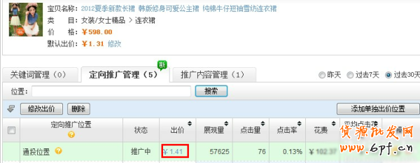 出價1.41,流量一個月才76個,說明這款寶貝的定向隱性質量得分非常低。那么如何提高定向的質量得分從而提高定向流量,達到0.4出價,引13000個點擊每天呢?寶貝前期的點擊率非常重要。