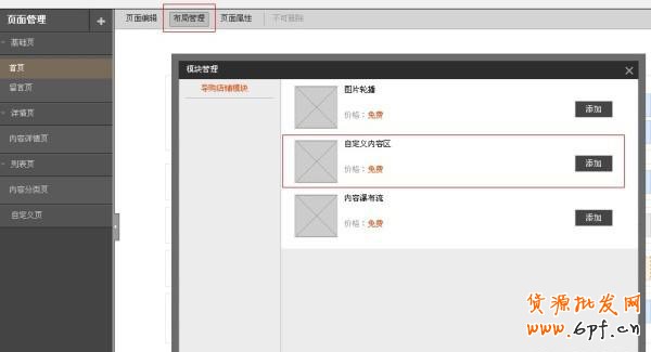 1、首先在U站裝修后臺,“布局管理”中去掉瀑布流的模塊,添加一個“自定義模塊”,并點擊保存,如下:
