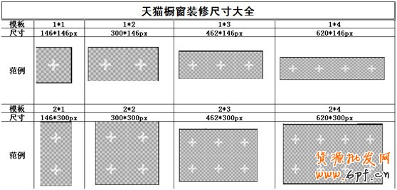 第三,頁面排版。天貓櫥窗的裝修,不僅僅是模板填充,而是模塊的自由組合再填充,多個小格可以拼接組合成不同大小的展位。讓店鋪首頁呈現更加多樣性。由上所示,最小的格子是1*1(146*146),最大的是2*4(620*300),這就給了裝修頁面很大的改變空間。