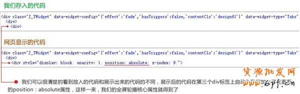 后來根據研究。在調用淘寶的輪播組件(官方開源JS模塊。也就是常用的普通輪播)代碼的時候,頁面會自動為組件內的代碼,置入一個position:absolute屬性,這樣說很難理解。我們直接上圖說明吧!
