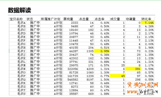 報表下載以后,掌柜無須借助多么復雜的軟件工具進行分析,只需使用我們常用的EXCEL即可達到選款的目的。我們首先在報表中找到四個數據維度分別對應的最大值,我們會發現,轉化率高的寶貝,對應的點擊率、成交量和收藏量卻相對較低;而點擊率高的寶貝,對應的成交量、收藏量和轉化率也并非很理想。所以從這里我們可以看出,按單一維度數據選款是不合理的。