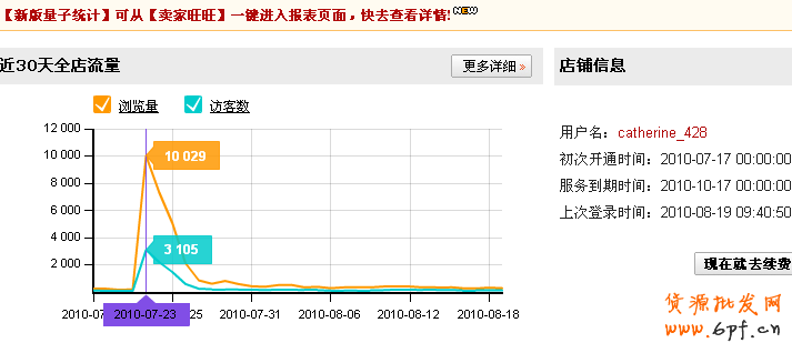 呵呵,這個淘寶量子統(tǒng)計是2010年7月17號才買的,價格不貴,好像一季才幾十塊。數(shù)據(jù)分析很全面,而且正好記錄了買家秀貼上幫派推薦位的這一周的井噴數(shù)據(jù)!23號貼子上推薦位的當(dāng)天,貼子瀏覽量是近兩萬左右,店鋪流量是一萬多,店鋪銷售額是一萬多。大家請看下面這些數(shù)據(jù)截屏。這個瀏覽量和銷量的轉(zhuǎn)換率非常高哈!
