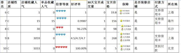 4.收藏人氣的作用似乎沒有其他人所說的那么重要。表中有接近一半的店鋪和寶貝的收藏人氣很一般。另外,如果比較店鋪收藏人氣和寶貝收藏人氣,我發現前者的權重要大一些,從表中可以看出,排名前10的寶貝的收藏人氣沒有一個超過1000的。值得一提的是,現在刷收藏非常盛行,淘寶不應該不知道這個現象,如果刷收藏能夠明顯提高流量,那么很多人都可以這么做,因為這樣做太容易了。我相信淘寶會對收藏人氣的權重有所考慮。