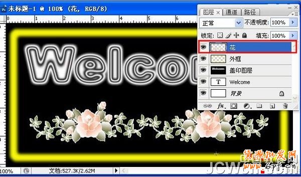 8、在外框圖層上面用移動(dòng)工具拉入花朵作為裝飾。