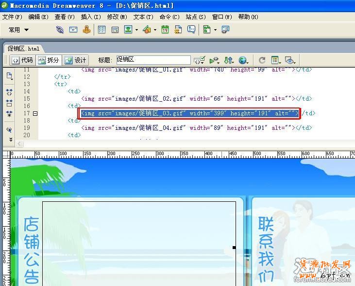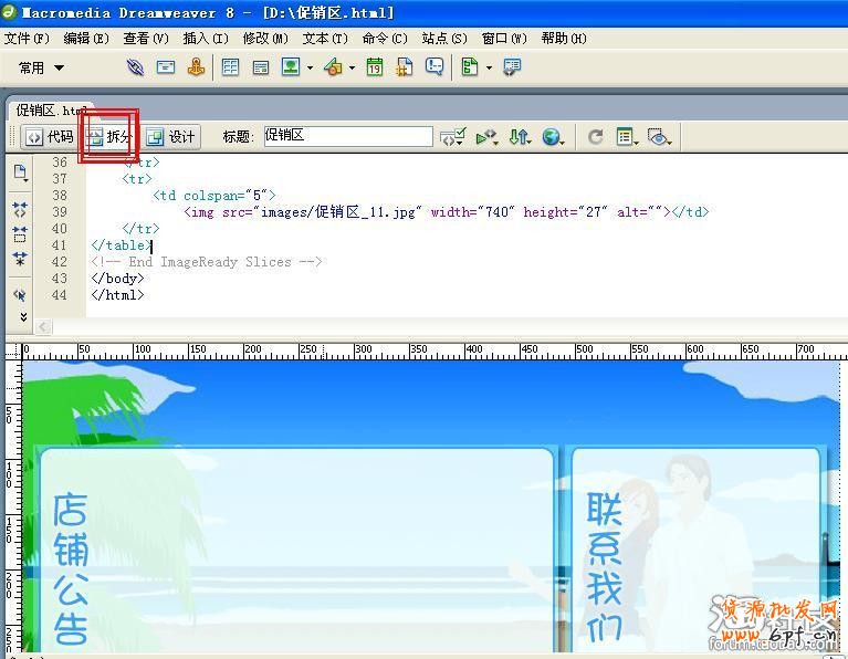 2、用Dreamweaver8.0打開“促銷區.html”文件。并切換到“拆分”模式。在此模式下,上半部分為代碼區,下半部分為設計區。