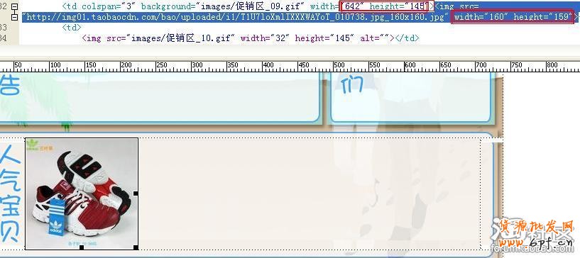 細心的親們會發現,在圖上紅色框中有兩組數據,一組為width = 642 height = 145,這組數據是說明我們的人氣寶貝展示區的寬為642,高為145;另一組數據為width = 160,height = 159,這組數據是說明我們插入的圖片寬為160,高為159。這就說明我們的圖片過大,為了不撐破表格,就必須將圖片的寬和高兩個數據都改為小于145,比如改為140。修改完畢后,就能保證圖片不會把人氣寶貝區的表格撐破。如下圖所示: