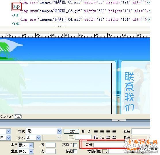 此時可以看到在屏幕下方出現單元格背景框。在背景框內填入images/促銷區_03.gif,并在左邊設置寬為399,高為191,設置完畢之后,刪除單元格中的圖片,最終如下圖所示: