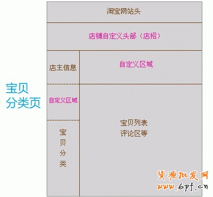 圖中除了寶貝展示頁的掌柜推薦、自動推薦,粉色字體所顯示的店招、自定義區域都是可裝修的地方。