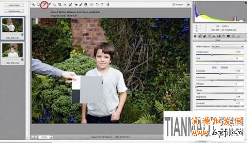 在將照片傳入電腦之后,首先在camera raw(photoshop處理RAW文件的插件)中加載在相同光線環境下的照片,然后找到帶有灰卡的那一張(一般是第一張)從頂部工具條中選擇白平衡工具,并點擊招聘中的灰卡,調整白平衡。