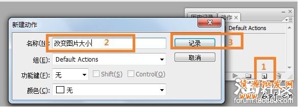 第二步:單擊動作命令欄“創建新動作”快捷命令圖標,此時就會在“默認動作”的序列下創建新動作,出現命令對話框,在“名稱”欄中輸入“改變圖片大小”,然后單擊[