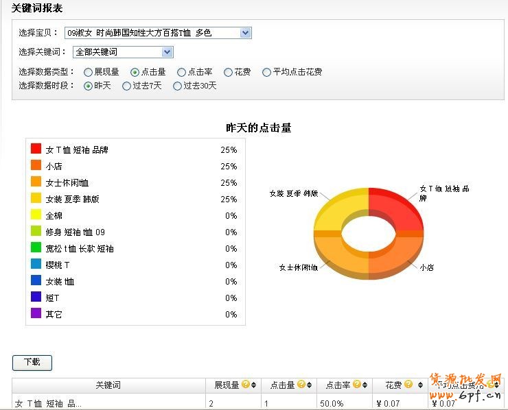 這張表反映的是關鍵詞所獲得的點擊量,可以查看所有寶貝上排名前20的關鍵詞流量,也可以查看單個寶貝上所有關鍵詞的流量情況,帶來更多點擊的詞肯定是要重點利用的詞,長期沒有點擊的詞就要及時更換,點擊量零零星星的詞要看看是不是都沒有別人用的,或者出價在0.2以下的,如果詞沒什么人用,要調整,太長太偏的詞沒意義,如果詞有很多人搜索的,但是出價低,就要及時加價。