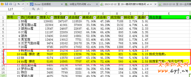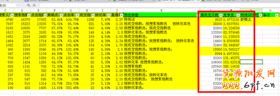 1).選中第一行,自動(dòng)篩選,給數(shù)據(jù)項(xiàng)添加自動(dòng)篩選卡  添加好自動(dòng)選項(xiàng)卡后如圖(數(shù)據(jù)項(xiàng)會(huì)多一個(gè)倒三角標(biāo)簽)  準(zhǔn)備工作完成,接下來(lái)需要先按三個(gè)數(shù)據(jù)項(xiàng)單維度選出我們的數(shù)據(jù),依次是:成交指數(shù),轉(zhuǎn)化率,搜索指數(shù)(為什么選擇依次選擇這3個(gè)數(shù)據(jù),大家回頭去看文章前面的優(yōu)化標(biāo)題的三個(gè)目的就明白,成交指數(shù)=搜索指數(shù)*轉(zhuǎn)化率,我們需要按照單一維度選擇然后再綜合分析,是不是想到了物理中的控制變量法:)