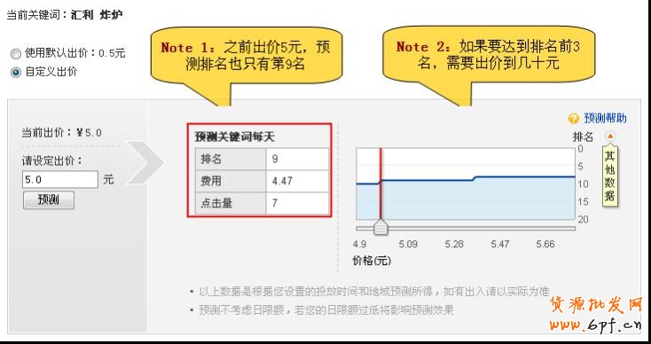 7、該關鍵詞很多人推薦的 有時我們選擇的關鍵詞是很多商家推薦的,同時展示量也很高的,排名靠前的出的價都比較 高,我們的默認出價基本上排在3、4頁;這種狀況我們也沒必要去爭第一頁的展示位,選擇 在第三、四頁的最佳位置出現也還是很不錯的。 例如同樣是“匯利 炸爐”這個關鍵詞,我們之前出價是5元,排名是第9名,這個代價太高了 哦;我們把出價降到1.6元,排名是40名,展示位在第四頁第一位;出價比較多的,說明這 個產品是比較多商家賣也比較熱賣的,因此我們在第四頁同樣有效果。