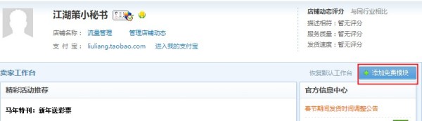 進入賣家中心后臺,點擊上圖中的“添加免費模塊”,即彈出下圖中的對話框,找到“江湖策”,點擊添加即可。