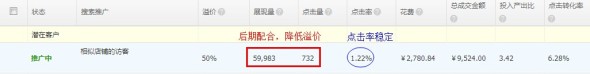 直通車潛在客戶最終溢價:50%左右,溢價降低,點擊率穩定,展現量提高,點擊量提高,并且轉化效果穩定。