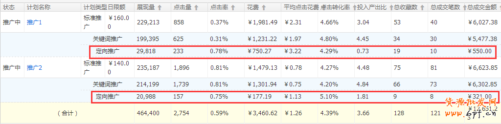 分詞從上表可看出:(計劃:“推廣1”要比“推廣2”點擊率低于2倍)“推廣1”計劃點擊率為0.37%,“推廣2”點擊率為“0.81%”,看到這里,大家肯定都會覺得“推廣1”計劃就是我們要抓的“目標(biāo)”,但是大家有沒有注意到,兩個計劃“定向推廣”的點擊率數(shù)據(jù)計劃“推廣1”中的點擊率表現(xiàn)是最好的(圖中紅色方框內(nèi)),所以下面可以將“推廣2”中的定向推廣力度進(jìn)行降低控制,當(dāng)然我們的“推廣1”計劃也不能忽略,這里要提醒大家:在進(jìn)行排查的時候,不要單單只看計劃整體的點擊率,也要細(xì)分到內(nèi)部數(shù)據(jù),如下圖: