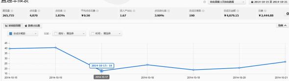 第一周主要是對店鋪的熟悉和契合度的掌控;關鍵性的轉折就在第二周,從第二周開始,也就是十一假期剛過,淘寶的買家購買力正在逐步的恢復,我們的力度也開始加大;花費開始提升,并且成交筆數也在不停的攀升;第二周的最后一天,也就是14號,我們的日成交量已經達到了51筆,這個數字比之前翻了3倍多,掌柜開始對我們有了基礎的信任,他認為我們可以把他的店做起來,因為這個時間段,我們的數據一直在提升,成交筆數開始翻翻,自然就有了更深的探討。