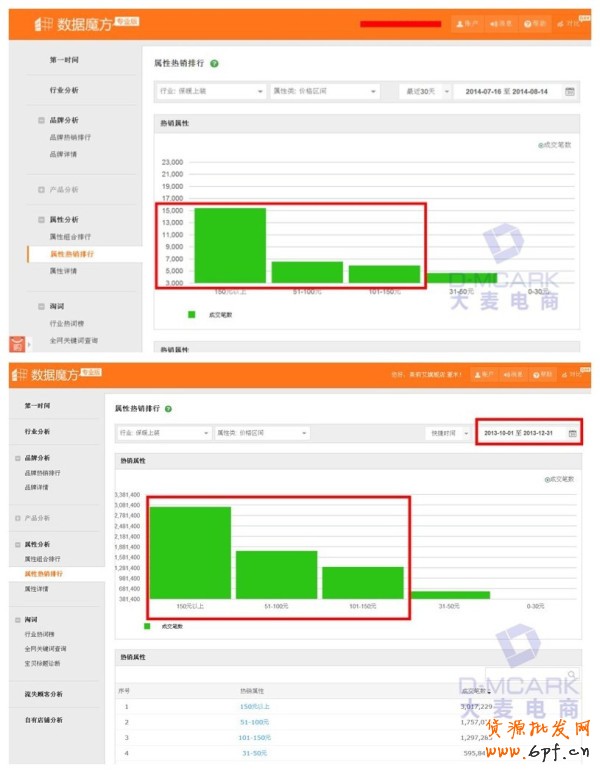 對寶貝類型基本定型后,寶貝其中一個關鍵的因素——價格,也是需要根據同期和最近的數據對比來分析總結得出。如下圖所示,保暖上衣去年同期(2013年10月~12月)一口價分布為150元以上占比最多,排第二是50元~100元這個區間,排第三是101~150元這個區間。而最近三十天的銷售數據來看,這個分布也是一致的。因此,建議店主可參考這些市場數據來推斷寶貝價格。但這里值得一提是,【數據魔方】這里顯示的價格是一口價,而非最終售賣價格,建議店主根據當時市場客觀真實情況和店鋪利潤比例,再定寶貝折后價或促銷價格。