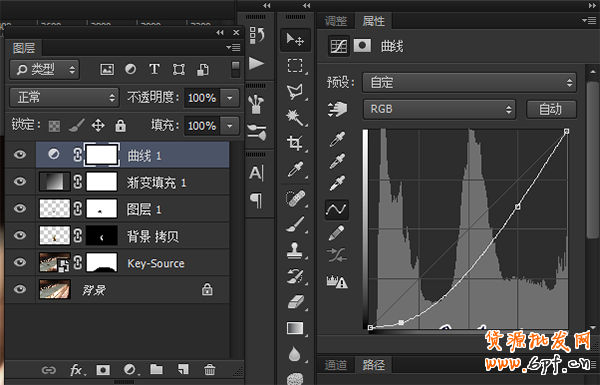 看曲線調整層的蒙版,相信你們懂得怎么做了,就是用畫筆把中間擦亮,目的就是為了壓暗四周。