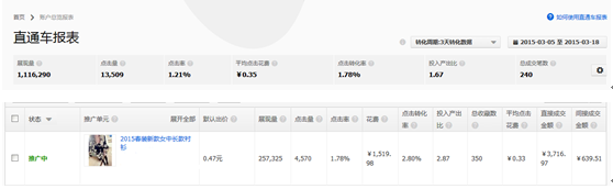 1、挑選寶貝:隨著春季的到來,店鋪已經(jīng)上新一批春款的寶貝,通過直通車進行寶貝測試,打造重點款的寶貝。前期要對于店鋪中上新的寶貝進行測款,主要進行測試襯衫與褲裝。