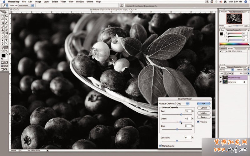 3、點擊“圖層”--“調整”--“通道混合器”,我們在上一步驟中看到藍莓的質感在紅色通道中表現情況比較理想。所以,我們需要盡可能保留多一些紅色通道的值。另外,綠色區將葉子和藍莓區分出來,所以,綠色通道也要運用起來。而藍色通道,我們看到噪點很多畫面也是比較暗,所以,這里我們現不動它。跟著我們回到“圖像”——“調整”——“通道混合器”,給紅色55%,綠色45%。