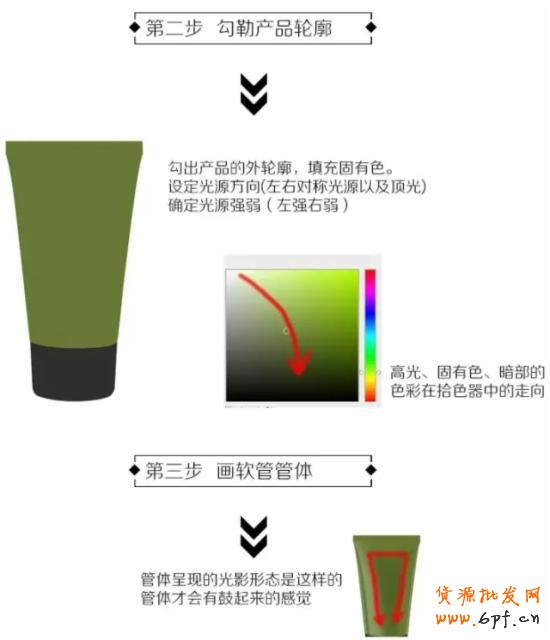 第二步:勾勒產(chǎn)品輪廓,先勾出產(chǎn)品的外輪廓,填充固有顏色,設(shè)定光源方向(左右對稱光源以及頂光)確定光源強弱(左強右弱)