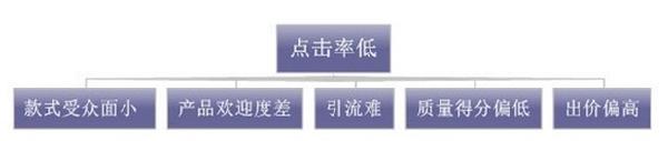一般來說,在直通車推廣中,車能否順利開起來,點擊率是最核心的問題,它不僅是影響質量得分的核心因素,也是打造爆款引流的先決條件,凡是爆款寶貝,點擊率都不會太低。而點擊率很低的寶貝,也很難成為爆款,若堅持要推廣此寶貝的話,耗費的代價和成本絕對很高。所以點擊率決定直通車的成敗,決定爆款的走向。而點擊率低的原因是什么?會有什么樣的后果?我們可以看一下以下這兩張思維導圖。