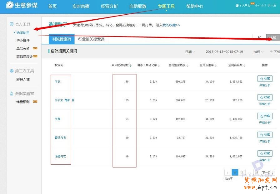 另外,我們可以從生意參謀的數據:專題工具——選詞助手——無線端中,這些詞是無線端進入我們店鋪的大詞,我們可以選擇一些符合我們寶貝的詞添加進直通車,為我們帶來更多精準的流量。