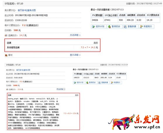 我們可以從計(jì)劃名中看到,這位掌柜把自己的目標(biāo)店鋪進(jìn)行了分類,并且在7月11號這一天在首頁4輪播焦點(diǎn)圖同一個(gè)位置上建立了不同的2個(gè)計(jì)劃。時(shí)間段是互為補(bǔ)充的。目的就在于保證獲取精準(zhǔn)流量的前提下更好的降低自己的廣告成本。