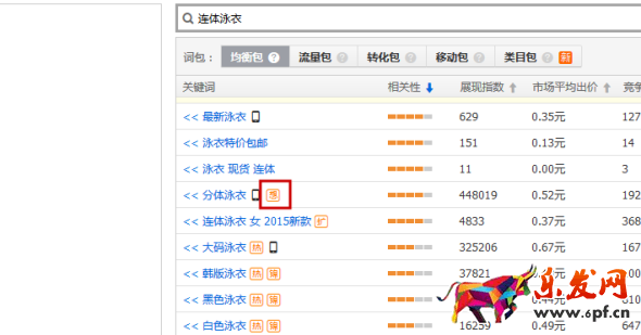 系統將從不同的維度推薦的關鍵詞分為5個詞包,為均衡包、流量包、轉化包、移動包、類目包。