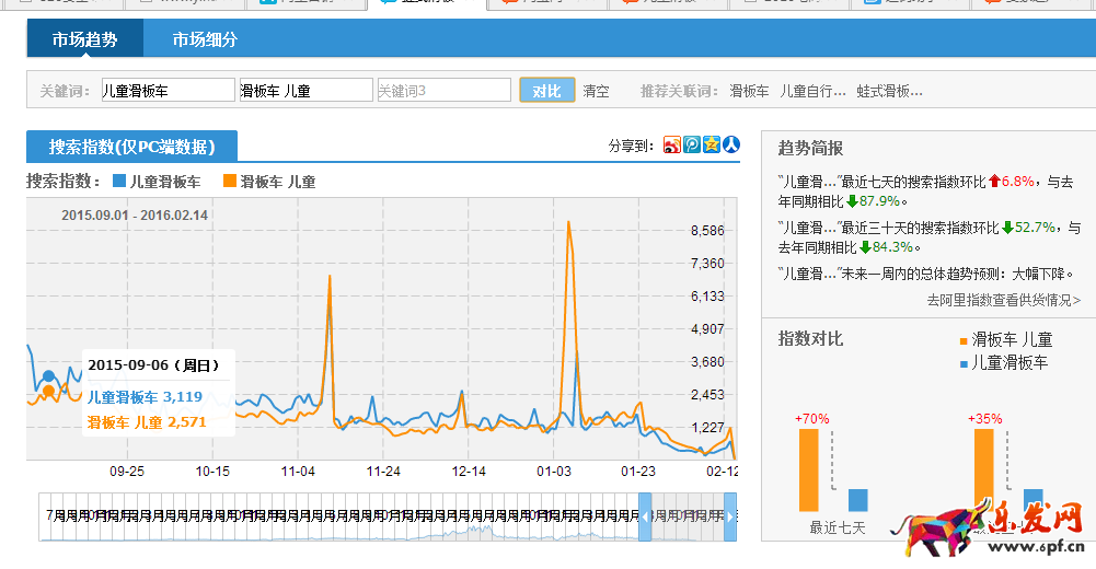 兩個(gè)關(guān)鍵詞,可以在淘寶引擎上試一下,搜索下拉出現(xiàn)“滑板車 兒童”關(guān)鍵字。這說(shuō)明對(duì)比兩個(gè)關(guān)鍵詞,帶空格的關(guān)鍵詞權(quán)重更高。