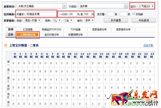 我擦,這玩意兒還要配合!!!當然需要,說過很多次,店鋪做的好不好,其實都是一個又一個的細節堆積到一起的,這一點我做到了,你沒有做,至少在這個得分上,我就取得了領先。。我們假設一下,你準備重點優化的關鍵詞,根據店鋪的實際情況,準備是:長袖連衣裙。路徑:生e經——行業分析——我的情報——情報助手——選擇好類目——寶貝按人氣前200排序——填好關鍵字——選擇好你準備競爭的價格區間——點擊上架時間分布,看下圖:哎呀,我去!!!這數據太牛逼了吧!是的,太牛逼了!(注:截圖都是截了一半兒,不完全,然后數據可以下載!)