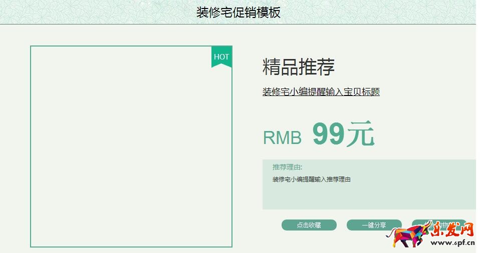 <div style="width:950px;height:auto; overflow:hidden;font-size:12px;background:#f2f5ee;"> <div class="sg-hd" style="overflow:hidden;zoom:1;margin-bottom:10px;font-family:微軟雅黑;"> <div style="overflow:hidden;height:50px;line-height:50px;background:#5ea591 url(https://img.alicdn.com/imgextra/i1/11193727/TB2J3TWdY0kpuFjy0FjXXcBbVXa-11193727.jpg) no-repeat center center;text-align:center;"> <span style="font-size:24px;overflow:hidden;color:#000;padding-left:2px;">促銷模板</span> </div> </div><div style="width:910px;background-color:#f2f5ee;font-family:Arial;overflow: hidden;padding: 20px;"> <ul> <li style=" width:910px;overflow: hidden;margin-bottom:20px;background-color: "> <div style=" float:left; width:400px;height:400px;border:2px solid #50ab91;"> <a style="width:400px;height:400px;text-decoration:none; display:block;background: url(小編提醒這里輸入寶貝圖片鏈接) no-repeat center center;" href="小編提醒這里輸入寶貝鏈接" target="_blank"> <span style="float:right;text-align:center;font-size:14px;line-height:40px;font-family:微軟雅黑;overflow:hidden;color:#fff;width:40px;height:42px;background:url(https://img.alicdn.com/imgextra/i3/11193727/TB2Z2Tbe.lnpuFjSZFjXXXTaVXa-11193727.png) center center no-repeat;">HOT</span> </a> </div> <div style="width:506px;height: 404px;float:left;;"> <span style=" margin:20px 0px 20px 60px;height:42px;line-height: 42px;display: block;font-size:36px;font-family:微軟雅黑;color:#323232;overflow: hidden">精品推薦</span> <a href="小編提醒這里輸入寶貝鏈接" target="_blank" style=" margin:20px 0px 20px 60px;height:42px;line-height: 20px;display: block;font-size:18px;font-family:微軟雅黑;color:#000;overflow: hidden">小編提醒輸入寶貝標題</a> <div style="height:64px;margin:20px 0px 20px 60px;line-height:64px;overflow: hidden;"> <span style=" font-size:36px;color: #50ab91">RMB  <b style="font-size:60px;">小編提醒輸入寶貝價格</b> </span> </div> <div style=" margin:20px 0px 20px 60px;height:100px;font-family:微軟雅黑;color:#323232;overflow: hidden;background: #d8e9df;"> <div style=" margin:5px 20px;font-size:14px;color:#5ea591;overflow: hidden;height: 20px;line-height: 18px;">推薦理由:</div> <p style=" margin:5px 20px;height:60px;line-height:20px;overflow:hidden;">小編提醒輸入推薦理由</p> </div> <div style="margin:20px 0px 20px 60px;height:24px;overflow: hidden;text-align: center;"> <a href="小編提醒這里輸入寶貝鏈接&itemtype=1" target="_blank" style="float:left;margin: 0 20px 0 38px;text-decoration:none;display:block;overflow:hidden;width:110px;height: 22px;line-height:22px; border-radius: 10px;color:#FFF;background:#5ea591;">點擊收藏</a><div class="sns-widget" title="分享" style="cursor:pointer;float:left;margin: 0 20px 0 0;text-decoration:none;display:block;overflow:hidden;width:110px;height: 22px;line-height:22px; border-radius: 10px;color:#FFF;background:#5ea591;" data-sharebtn="{skinType:2,type:'item',key:'537053100191',comment:'小編提醒輸入寶貝標題',pic:'',client_id:68,isShowFriend:false}">一鍵分享</div> <a class="J_CartPluginTrigger" href="小編提醒這里輸入寶貝鏈接" target="_blank" style="float:left;text-decoration:none;display:block;overflow:hidden;width:110px;height: 22px;line-height:22px; border-radius: 10px;color:#FFF;background:#5ea591;">加入購物車</a> </div> </div> </li> <li style=" width:910px;overflow: hidden;margin-bottom:0px;background-color: "> <div style=" float: right; width:400px;height:400px;border:2px solid #50ab91;"> <a style="width:400px;height:400px;text-decoration:none; display:block;background: url(小編提醒這里輸入寶貝圖片鏈接) no-repeat center center;" href="小編提醒這里輸入寶貝鏈接" target="_blank"> <span style="float:right;text-align:center;font-size:14px;line-height:40px;font-family:微軟雅黑;overflow:hidden;color:#fff;width:40px;height:42px;background:url(https://img.alicdn.com/imgextra/i3/11193727/TB2Z2Tbe.lnpuFjSZFjXXXTaVXa-11193727.png) center center no-repeat;">HOT</span> </a> </div> <div style="width:506px;height: 404px;float: right;;"> <span style=" margin:20px 60px 20px 0px;height:42px;line-height: 42px;display: block;font-size:36px;font-family:微軟雅黑;color:#323232;overflow: hidden">精品推薦</span> <a href="小編提醒這里輸入寶貝鏈接" target="_blank" style=" margin:20px 60px 20px 0px;height:42px;line-height: 20px;display: block;font-size:18px;font-family:微軟雅黑;color:#000;overflow: hidden">小編提醒輸入寶貝標題</a> <div style="height:64px;margin:20px 60px 20px 0px;line-height:64px;overflow: hidden;"> <span style=" font-size:36px;color: #50ab91">RMB  <b style="font-size:60px;">小編提醒輸入寶貝價格</b> </span> </div> <div style=" margin:20px 60px 20px 0px;height:100px;font-family:微軟雅黑;color:#323232;overflow: hidden;background: #d8e9df;"> <div style=" margin:5px 20px;font-size:14px;color:#5ea591;overflow: hidden;height: 20px;line-height: 18px;">推薦理由:</div> <p style=" margin:5px 20px;height:60px;line-height:20px;overflow:hidden;">小編提醒輸入推薦理由</p> </div> <div style="margin:20px 60px 20px 0px;height:24px;overflow: hidden;text-align: center;"> <a href="小編提醒這里輸入寶貝鏈接&itemtype=1" target="_blank" style="float:left;margin: 0 20px 0 38px;text-decoration:none;display:block;overflow:hidden;width:110px;height: 22px;line-height:22px; border-radius: 10px;color:#FFF;background:#5ea591;">點擊收藏</a><div class="sns-widget" title="分享" style="cursor:pointer;float:left;margin: 0 20px 0 0;text-decoration:none;display:block;overflow:hidden;width:110px;height: 22px;line-height:22px; border-radius: 10px;color:#FFF;background:#5ea591;" data-sharebtn="{skinType:2,type:'item',key:'544532910420',comment:'小編提醒輸入寶貝標題',pic:'',client_id:68,isShowFriend:false}">一鍵分享</div> <a class="J_CartPluginTrigger" href="小編提醒這里輸入寶貝鏈接" target="_
