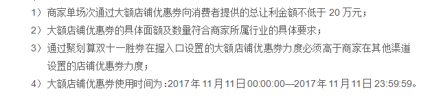 大額店鋪優惠券必須是入圍聚劃算2017雙十一聚劃算品牌團的天貓商家,開始設置時間:10月16日10:00,使用時間: 11月11日00:00:00—11月11日 23:59:59。具體要求如下: