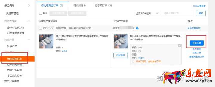 如果你的淘寶店有買家付款之后,在1688淘管家后臺的“淘寶拉回訂單”就能看到這個訂單信息,你點擊“普通下單”,付完貨款之后供應商就給你發貨,買家那邊確認收貨之后,你就能賺到這筆差價。