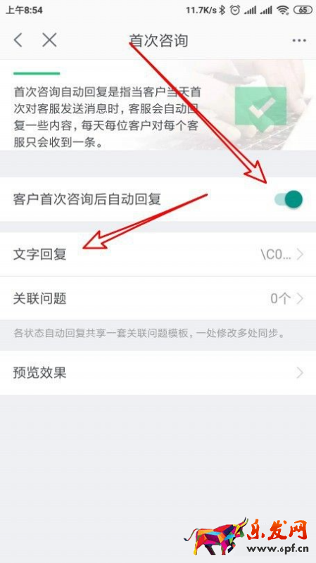5、在打開的設置窗口中點擊“客戶首次咨詢后自動回復”后面的開關,把其設置為打開的狀態,同時點擊下面的“文字回復”的菜單項。