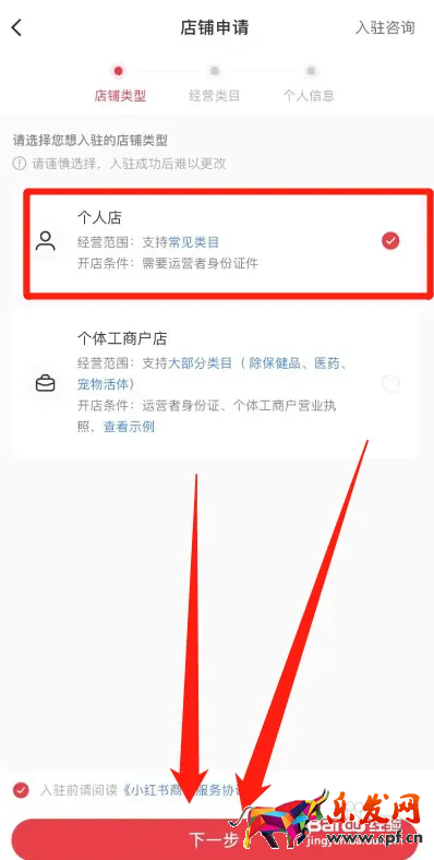 4 最后在開通類型界面選擇:個人店鋪,點擊下一步,選擇經營范圍并上傳個人身份證信息后就可以申請開通店鋪了