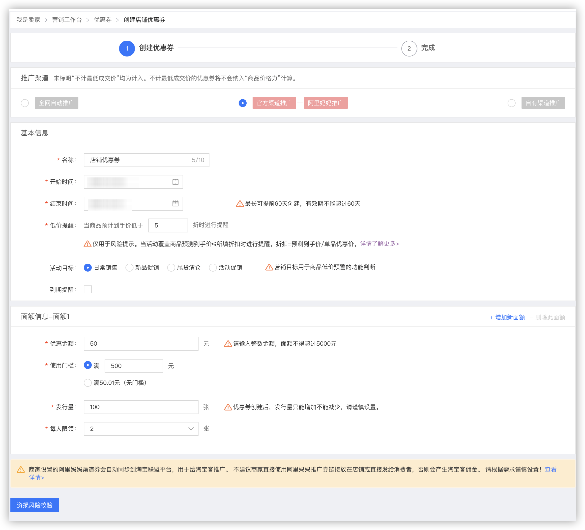 步驟三:填寫面額信息。無門檻的優(yōu)惠券只支持【官方渠道推廣】這一個推廣渠道,如果你設(shè)置的優(yōu)惠金額是50元,那么在使用門檻哪里點擊【滿50.01元】就可以啦。大家要記住,把優(yōu)惠券的領(lǐng)取數(shù)量設(shè)置一個限制,如果限領(lǐng)兩張,那么顧客領(lǐng)了兩張之后,不能再次領(lǐng)取,無論對方有沒有已經(jīng)使用。
