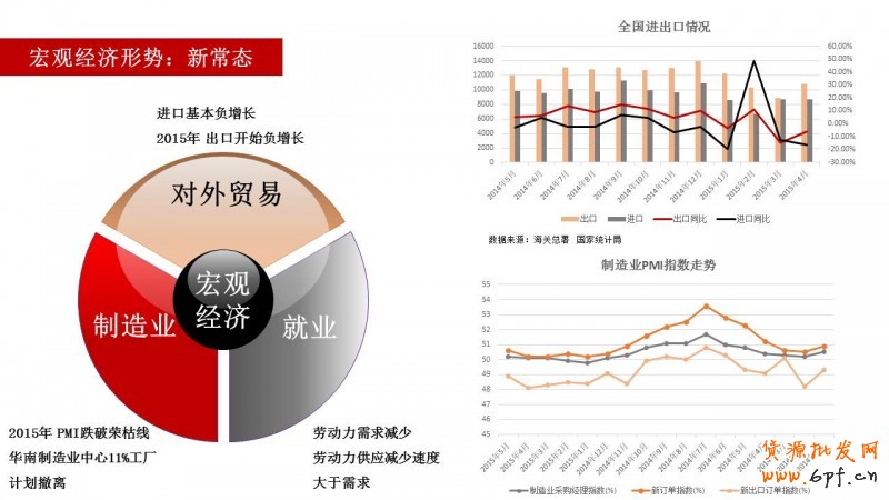 首先來(lái)談中國(guó)現(xiàn)在面臨的宏觀形勢(shì)。從對(duì)外貿(mào)易上說(shuō),這兩年一直處于下行的階段。進(jìn)口方面一直保持負(fù)增長(zhǎng)的水平。出口稍好一些,但是增速非常的低。進(jìn)入15年之后,前幾個(gè)月依然是負(fù)增長(zhǎng),形勢(shì)非常嚴(yán)峻。同時(shí),制造業(yè)PMI一直處于上下徘徊的階段,在今年的前幾個(gè)月甚至低于了50%,狀況堪憂。從勞動(dòng)力的情況來(lái)看,現(xiàn)在勞動(dòng)力成本每年以10%以上的速度增長(zhǎng)。根據(jù)人社部數(shù)據(jù)顯示,勞動(dòng)力的需求在下降,而勞動(dòng)力的供給比需求下降的還要快。學(xué)術(shù)界公認(rèn),2015年是拐點(diǎn)到來(lái)的時(shí)刻,從今年以后,勞動(dòng)力的形勢(shì)會(huì)更加的嚴(yán)峻。